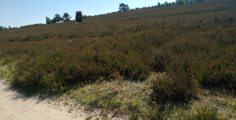 Nach circa einer Stunde durch die morgendliche Hitze der Heide erreichte ich Wilsede. Ein kleines Heidedorf. Von dort ging es auf die höchste Erhebung, den Wilsederberg (169m). Von dort "oben" gab es einen schönen Überblick über die Weite braune Heide (in Lila bestimmt wunderschön). Die Sonnenenergie nutze ich, um mein Handy zu laden und lief weiter dem Tagesziel Niederhaverbeck entgegen. Gegen Mittag kam ich dort an. Und was soll ich sagen, inzwischen schmerzten meine Füße mehr als mein Rücken. Da ich mein Ziel erreicht hatte, konnte ich ganz entspannt weiterlaufen. Mit Nickerchen unter Tannen und dem Lauschen der Natur und Touristen. Ich lief bis in die Behringerheide.