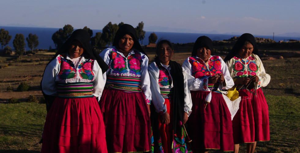 Die Insel Amantani mit einer atemberaubenden Aussicht über den See bei untergehender Sonne. Sowie die Landschaft bei strahlendem Sonnenschein.